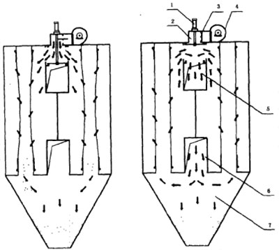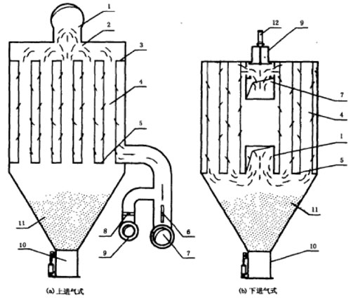其它型號烘干機袋式除塵器采用上部進氣方式,如圖所示,粉塵均由濾袋內(nèi)部自上而下通過,然后落入灰斗。粉塵對濾袋的磨損較為嚴重。
