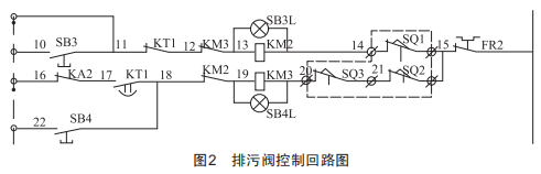 (2)回路元器件損壞。如圖2所示,按下sB4按鈕,限位正常,關(guān)排污閥無反應(yīng),需要查看熱偶FR2是否動作,或查看接觸器KM3是否缺相及節(jié)點損壞。熱偶動作需要復(fù)位,并檢查閥桿是否卡澀及超過行程,結(jié)合實際問題進行處理。
