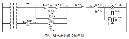 進水電磁閥控制回路如圖3所示,圖中23~29為接線端子編號,除塵器上水流程是電磁閥YV打開,水位到達備用水位時,觸發(fā)KA11動作,KA11的常閉節(jié)點斷開,電磁閥失電,停止注水。導(dǎo)致水箱漫水的原因主要有以下幾種:
